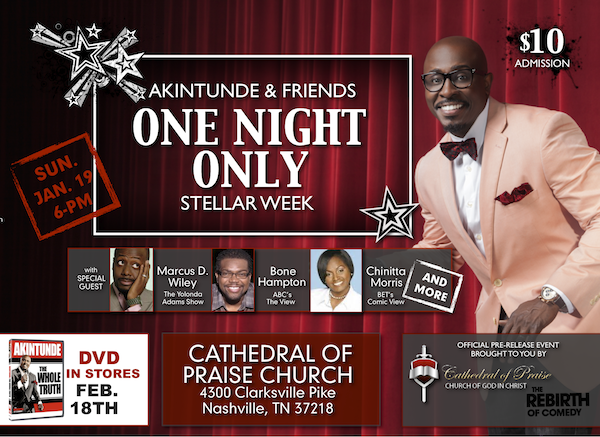 Christian Comedian Akintunde’s latest DVD, The Whole Truth will arrive into major retail outlets on February 18, 2014 (via E-One / Arrow-Records / No Joke Ent.), and the comedian known as The Minister Of Comedy, will celebrate with a special night of laughs and music in Nashville during Stellar Awards Week Sunday January 19th – 6 PM (CST) – Cathedral Of Praise.