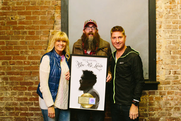 [Crowder is honored with an RIAA Gold Certification plaque for David Crowder*Band’s digital single “How He Loves” with sixstepsrecords’ Shelley Giglio and Mike McCloskey.]