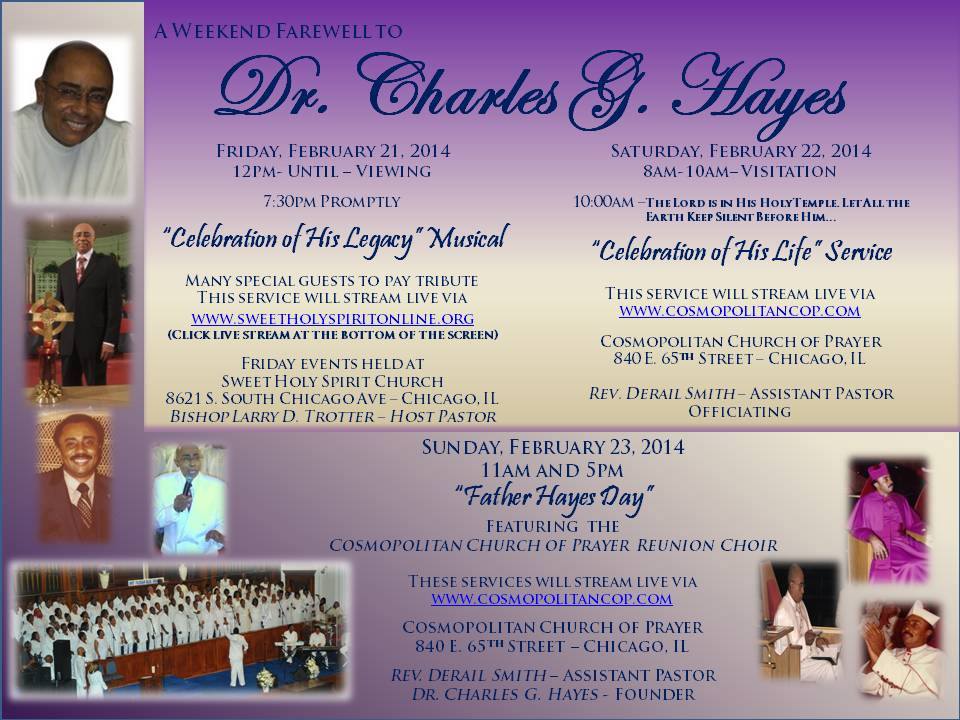 ABOUT Dr. Charles Hayes:In April 1959, Dr. Charles G. Hayes founded the Cosmopolitan Church of Prayer in the basement of Morris Jackson’s home at 634 Woodland Park in Chicago. In those days, Hayes placed the folding chairs weekly and served as church pianist before he gave his sermon. Eventually, the church moved to a storefront on Cottage Grove Avenue. Hayes then began a Sunday night radio program.