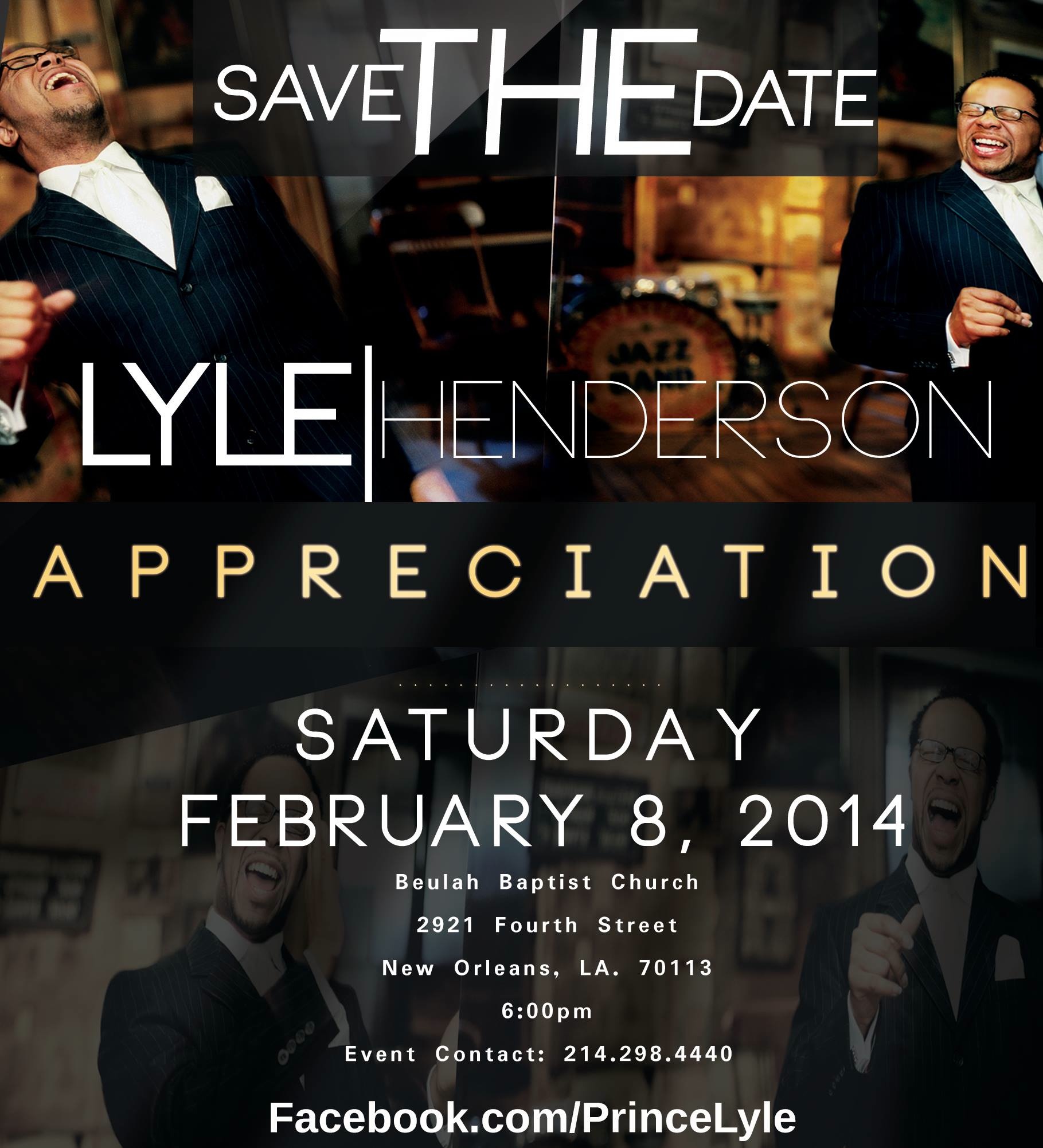 HueDon Designs is bringing the Jazz and Gospel music community together to extend congratulatory honor to the legacy of Lyle Henderson in a musical tribute on Saturday, February 8, 2014 at 6:00pm at the Beulah Baptist Church, 2921 Fourth Street in uptown New Orleans.